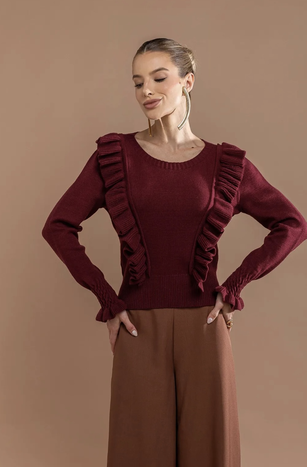 A blusa Luna é uma peça delicada e feminina, marcada pelos detalhes em babados que percorrem a parte frontal e os ombros, criando um visual elegante e cheio de movimento. Confeccionada em tricot de toque macio, possui modelagem levemente ajustada ao corpo, gola redonda e punhos com acabamento em elástico que valorizam o caimento das mangas.