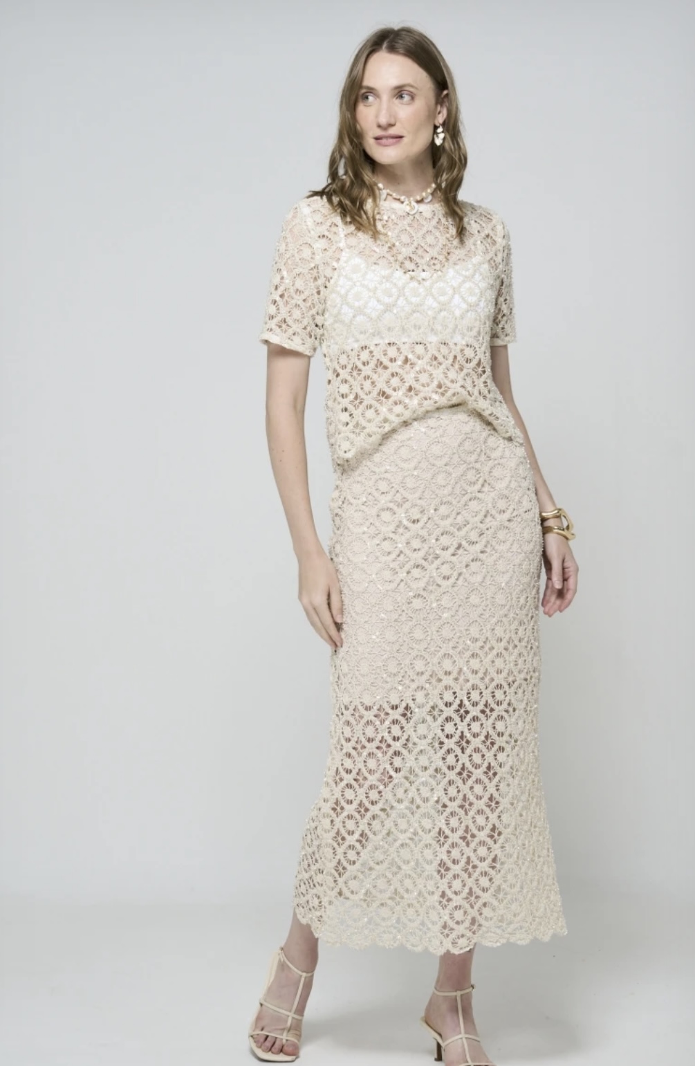 O tecido da saia é uma renda mais estruturada, com um acabamento mais grosso, diferenciado-se das rendas tradicionais, com desenhos em relevo e fundo vazado.