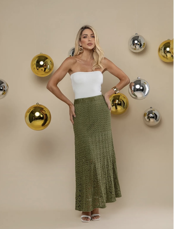 A saia Serenite é a união perfeita entre leveza, delicadeza e sofisticação. Produzida em tricot com trabalho rendado em ponto aberto, ela cria um visual fluido e elegante, com caimento que alonga a silhueta e traz movimento a cada passo.