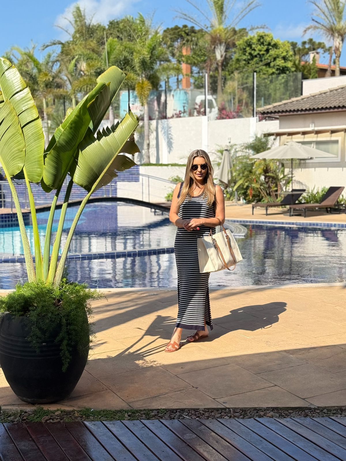 O vestido Gaivota é um modelo midi em tricot leve, com listras em tons neutros que trazem elegância e frescor. Possui modelagem reta, decote redondo e fendas laterais que garantem movimento e conforto, ideal para um visual casual e sofisticado.
